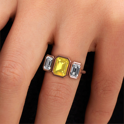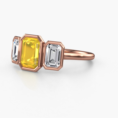 This 14 Carat rose gold ring is called Lavon 3 EME and is set with 8x6 mm yellow sapphire. This exclusive rose gold bezel set engagement ring is a true work of art! The ornaments are crafted with a lot of patience and great passion. In order to create this ring with great precision, this craft requires a keen eye and skilful hand. A challenge which ignites a fire in our expert goldsmith. The exquisite yellow sapphire are set in a special way so they stand out even more. This gives the ring an even more glamorous appearance. The special engagement ring is actually unique on its own because of the gemstones which we carefully select especially for this ring. On top of that you select the precious metals which will be used to create a unique ring for the most extraordinary woman in your life! This jewel [extra1_long][bestp1v_long]Do you have a specific ring in mind? One you came across somewhere. Please feel free to tell us your wishes and we will turn your design into a unique engagement ring. You can follow the development of your ring design because we use 3D drawings. This gives you a realistic preview of your design. We will gladly send you a non-binding offer, based on a fair price/ quality ratio. It will amaze you.To make it easier for you, we offer a 30 day return policy. Check our terms and conditions.