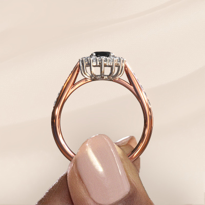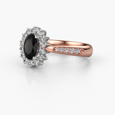 The ring shown above is called the Margien 2. We call this a Lady Diana ring. With an Lady Diana engagement ring, the larger centre gem is encircled by smaller side stones. This 14 Carat rose gold ring is set with a 1.05 crt oval black diamond gemstone, surrounded by smaller diamonds side stones. It's the most famous and celebrated engagement ring in the world; The Lady Diana ring. Exclusively meant for the most remarkable person in your life! A truly stunning aspect of this Lady Diana ring is its centre black diamond. The smaller side stones embracing the black diamond emphasize the sparkle of the centre gemstone, this makes it look as though they merge into one big gemstone. Due to its design, this is even more apparent in the Lady Di ring. Our expert Goldsmiths are keen to create a unique ring just for you. We can even customize the ring to your liking in our own crafting studio. This piece of jewellery is created to add sparkle to your finger, each jewel is lovingly made by hand by our goldsmiths.Are you on a budget? Please feel free to contact us, so we can go discuss your options. We offer our engagement rings at guaranteed best price, because we make them to order. You won't find such a price anywhere else!Our team adds new designs to our online collection daily. Our designers and goldsmiths work together in creating the best design. We strive to offer a diverse collection of jewels. Perhaps you have a specific jewel design in mind. One you came across somewhere. Please contact us for a free consultation. We will make you an offer, based on a fair price/ quality ratio, that will baffle you.To make it easier for you, we offer a 30 day return policy. Check our terms and conditions.