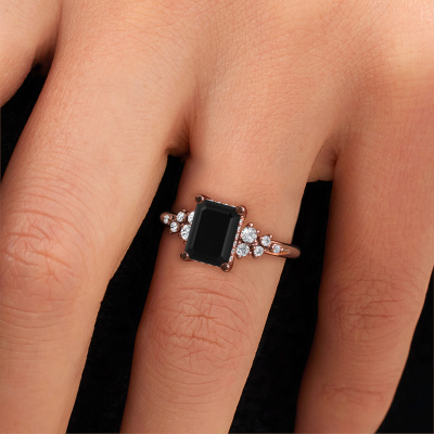 The ring shown above is called the Emma EME. We call this type of ring a pavé solitaire ring because it has one centre gemstone and a band that is also pave set with gemstones. This engagement ring is made in 14 Carat rose gold set with a 2.10 crt emerald cut black diamond, and pave set lab-grown diamonds at the sides. Each piece of jewellery is made with passion and love by one of our master goldsmiths.This fantasy rose gold pavé solitaire engagement ring has an exquisite emerald cut black diamond centre stone. To further accentuate the centre stone, the band is set full with more lab-grown diamonds. Its open prong setting allows light to strike the black diamond from various angles and this adds sparkle to your black diamond ring. The photo shown above depicts the goldsmith's carefully handcrafted details of the ring. The high positioning of the centre stone is truly eye-catching. The perfect engagement ring for the crown jewel of your life!After receiving your order, our goldsmiths will passionately start the creative process of making your engagement ring in our own studio. Because we don't have a big stockpile, these costs will not be passed on to you. Our pricing is proof of that! We offer top quality jewels at lowest price, guaranteed.Our team adds new designs to our online collection daily. Our designers and goldsmiths work together in creating the best design. We strive to offer a diverse collection of jewels. Perhaps you have a specific jewel design in mind. One you came across somewhere. Please contact us for a free consultation. We will make you an offer, based on a fair price/ quality ratio, that will baffle you.To make it easier for you, we offer a 30 day return policy. Check our terms and conditions.