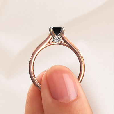 The ring shown above is called the Valorie eme 2. We call this type of ring a pavé solitaire ring because it has one centre gemstone and a band that is also pave set with gemstones. The 14 Carat rose gold engagement ring is set with a emerald cut 1.08 crt black diamond centre stone and the band is pave set with diamond gemstones. Each jewel is made by a team of passionate goldsmiths and jewel designers. This will make your crown jewel truly eye-catching.This classic rose gold pavé solitaire engagement ring has an exquisite emerald cut black diamond centre stone. To further accentuate the centre stone, the band is fully set with more diamonds. Its open prong setting allows light to strike the black diamond from various angles and this adds sparkle to your black diamond ring. The photo shown above depicts the goldsmith's carefully handcrafted details of the ring. The high positioning of the centre stone is truly eye-catching. The perfect engagement ring for the crown jewel of your life! By using our modern techniques, we can design and customize the finest quality jewels with the utmost care for you. Our engagement rings are always priced 30 percent lower than other jewellers. We make engagement rings to order so we don't have to maintain a large stock. If you have a certain budget, we are more than happy to advice you accordingly.Have you found a specific engagement ring somewhere which you would like to give to your loved one? Please feel free to express your wishes to our jewel designers because we would be honoured to turn your design into a classic engagement ring. You can follow the development of your ring design because we use 3D drawings. This gives you a realistic preview of how your design will look. You can also preorder a dummy. A dummy is a plastic ring, which can be shaped according your ring design. You can try it on and check if its width and size are suitable for you. We will gladly send you a non-binding offer, based on a fair price/ quality ratio. It will amaze you, considering the quality of the ring and gemstones.To make it easier for you, we offer a 30 day return policy. Check our terms and conditions.