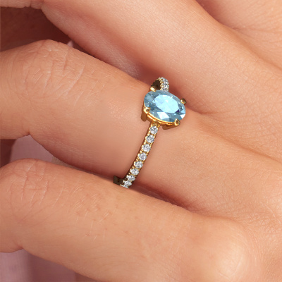 The ring shown above is called the Lynelle 2. We call this type of ring a pavé solitaire ring because it has one centre gemstone and a band that is also pave set with gemstones. This engagement ring is made in 14 Carat gold set with a 7x5 mm oval blue lab grown diamond, and pave set diamonds at the sides. Each piece of jewellery is created to add sparkle to your finger, each jewel is lovingly made by hand by our goldsmiths.This classic gold pavé solitaire engagement ring has an exquisite oval blue lab grown diamond centre stone. To further accentuate the centre stone, the band is set full with more diamonds. Its open prong setting allows light to strike the blue lab grown diamond from various angles and this adds sparkle to your blue lab grown diamond ring. The photo shown above depicts the goldsmith's carefully handcrafted details of the ring. The high positioning of the centre stone is truly eye-catching. The perfect engagement ring for the crown jewel of your life!After receiving your order, our goldsmiths will start the creative process of making your Lynelle 2 engagement ring. We don't keep stock. This is advantageous because these costs will not be passed on to you. Therefore, we can offer jewellery at exceptionally low prices.Do you have a specific ring in mind? One you came across somewhere. Please feel free to tell us your wishes and we will turn your design into a unique engagement ring. You can follow the development of your ring design because we use 3D drawings. This gives you a realistic preview of your design. We will gladly send you a non-binding offer, based on a fair price/ quality ratio. It will amaze you.To make it easier for you, we offer a 30 day return policy. Check our terms and conditions.