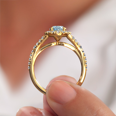 The ring shown above is called the Kimber OVL. We call this type of ring a pavé solitaire ring because it has one centre gemstone and a band that is also pave set with gemstones. The 14 Carat gold engagement ring is set with a oval 8x6 mm blue lab grown diamond centre stone and the band is pave set with lab grown diamond gemstones. Each jewel is made with passion and love by one of our master goldsmiths.This exclusive gold pavé solitaire engagement ring has an exquisite oval blue lab grown diamond centre stone. To further accentuate the centre stone, the band is fully set with more lab-grown diamonds. Its open prong setting allows light to strike the blue lab grown diamond from various angles and this adds sparkle to your blue lab grown diamond ring. The photo shown above depicts the goldsmith's carefully handcrafted details of the ring. The high positioning of the centre stone is truly eye-catching. The perfect engagement ring for the crown jewel of your life! By using a combination of the latest modern techniques, combined with ancient crafting, we can make all our engagement rings in our own studio. Each jewel is made to order. This is advantageous because we can offer you a price you won't find anywhere else.Our team adds new designs to our online collection daily. Our designers and goldsmiths work together in creating the best design. We strive to offer a diverse collection of jewels. Perhaps you have a specific jewel design in mind. One you came across somewhere. Please contact us for a free consultation. We will make you an offer, based on a fair price/ quality ratio, that will baffle you.To make it easier for you, we offer a 30 day return policy. Check our terms and conditions.