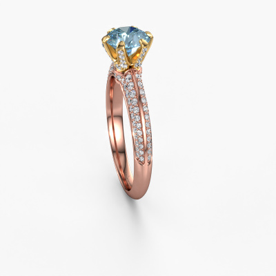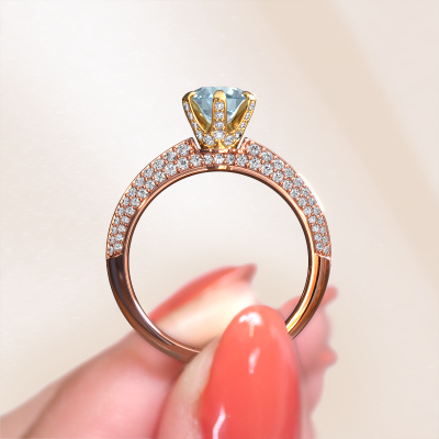 The ring shown above is called the Abby. We call this type of ring a pavé solitaire ring because it has one centre gemstone and a band that is also pave set with gemstones. The 14 Carat rose gold engagement ring is set with a round 6.5 mm blue lab grown diamond centre stone and the band is pave set with diamond gemstones. Each jewel is made just for you by our master goldsmiths in our own studio.This exclusive rose gold pavé solitaire engagement ring has an exquisite round blue lab grown diamond centre stone. To further accentuate the centre stone, the band is fully set with more diamonds. Its open prong setting allows light to strike the blue lab grown diamond from various angles and this adds sparkle to your blue lab grown diamond ring. The photo shown above depicts the goldsmith's carefully handcrafted details of the ring. The high positioning of the centre stone is truly eye-catching. The perfect engagement ring for the crown jewel of your life! Are you on a budget? Please feel free to contact us, so we can go discuss your options. We offer our engagement rings at guaranteed best price, because we make them to order. You won't find such a price anywhere else!Our team adds new designs to our online collection daily. Our designers and goldsmiths work together in creating the best design. We strive to offer a diverse collection of jewels. Perhaps you have a specific jewel design in mind. One you came across somewhere. Please contact us for a free consultation. We will make you an offer, based on a fair price/ quality ratio, that will baffle you.To make it easier for you, we offer a 30 day return policy. Check our terms and conditions.
