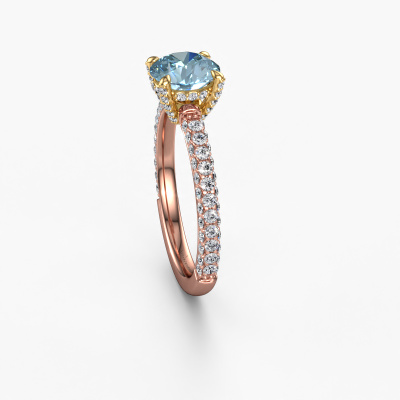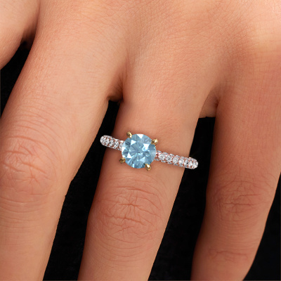 The ring shown above is called the Saskia rnd 2. We call this type of ring a pavé solitaire ring because it has one centre gemstone and a band that is also pave set with gemstones. The 14 Carat rose gold engagement ring is set with a round 7 mm blue lab grown diamond centre stone and the band is pave set with lab grown diamond gemstones. Each jewel is made by a team of passionate goldsmiths and jewel designers. This will make your crown jewel truly eye-catching.This exclusive rose gold pavé solitaire engagement ring has an exquisite round blue lab grown diamond centre stone. To further accentuate the centre stone, the band is fully set with more lab-grown diamonds. Its open prong setting allows light to strike the blue lab grown diamond from various angles and this adds sparkle to your blue lab grown diamond ring. The photo shown above depicts the goldsmith's carefully handcrafted details of the ring. The high positioning of the centre stone is truly eye-catching. The perfect engagement ring for the crown jewel of your life! After receiving your order, our goldsmiths will passionately start the creative process of making your engagement ring in our own studio. Because we don't have a big stockpile, these costs will not be passed on to you. Our pricing is proof of that! We offer top quality jewels at lowest price, guaranteed.Our team adds new designs to our online collection daily. Our designers and goldsmiths work together in creating the best design. We strive to offer a diverse collection of jewels. Perhaps you have a specific jewel design in mind. One you came across somewhere. Please contact us for a free consultation. We will make you an offer, based on a fair price/ quality ratio, that will baffle you.To make it easier for you, we offer a 30 day return policy. Check our terms and conditions.