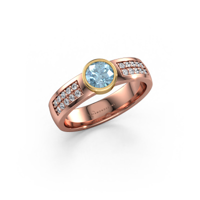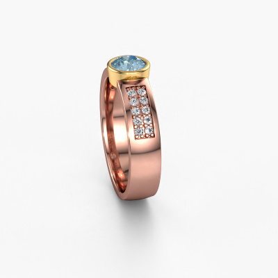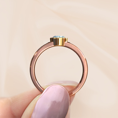 The ring shown above is called the Ise 3. We call this type of ring a pavé solitaire ring because it has one centre gemstone and a band that is also pave set with gemstones. The 14 Carat rose gold engagement ring is set with a round 4.7 mm blue lab grown diamond centre stone and the band is pave set with diamond gemstones. Each jewel is made just for you by our master goldsmiths in our own studio.This modern rose gold pavé solitaire engagement ring has an exquisite round blue lab grown diamond centre stone. To further accentuate the centre stone, the band is fully set with more diamonds. Its open prong setting allows light to strike the blue lab grown diamond from various angles and this adds sparkle to your blue lab grown diamond ring. The photo shown above depicts the goldsmith's carefully handcrafted details of the ring. The high positioning of the centre stone is truly eye-catching. The perfect engagement ring for the crown jewel of your life!