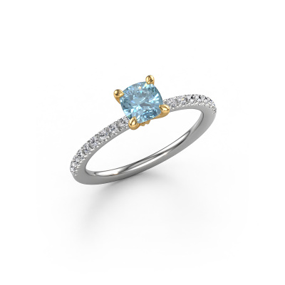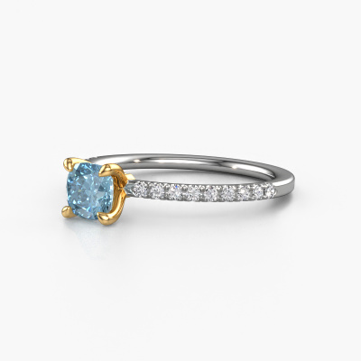 The ring shown above is called the Crystal CUS 2. We call this type of ring a pavé solitaire ring because it has one centre gemstone and a band that is also pave set with gemstones. The 14 Carat white gold engagement ring is set with a cushion 5 mm blue lab grown diamond centre stone and the band is pave set with diamond gemstones. Each jewel is made just for you by our master goldsmiths in our own studio.This classic white gold pavé solitaire engagement ring has an exquisite cushion blue lab grown diamond centre stone. To further accentuate the centre stone, the band is fully set with more diamonds. Its open prong setting allows light to strike the blue lab grown diamond from various angles and this adds sparkle to your blue lab grown diamond ring. The photo shown above depicts the goldsmith's carefully handcrafted details of the ring. The high positioning of the centre stone is truly eye-catching. The perfect engagement ring for the crown jewel of your life! After receiving your order, our goldsmiths will start the creative process of making your Crystal CUS 2 engagement ring. We don't keep stock. This is advantageous because these costs will not be passed on to you. Therefore, we can offer jewellery at exceptionally low prices.Different styles of new rings are made daily by our team. Perhaps you have found a pavé solitaire engagement ring somewhere. One you would like to give to your loved one. Please feel free to share your thoughts and design with our jewel designers. We would love to turn your design into a classic engagement ring. You can follow the development of your ring design because we use very detailed 3D drawings. On top of that, you can order a dummy of the design. A dummy is a plastic ring, which can be shaped according your ring design. You can try it on and check if the engagement ring is up to standard. We will gladly send you a non-binding offer, based on a fair price/ quality ratio. The offer will baffle you, considering the quality of the ring and gemstones.To make it easier for you, we offer a 30 day return policy. Check our terms and conditions.