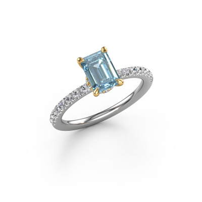 The ring shown above is called the Crystal EME 4. We call this type of ring a pavé solitaire ring because it has one centre gemstone and a band that is also pave set with gemstones. The 14 Carat white gold engagement ring is set with a emerald cut 7x5 mm blue lab grown diamond centre stone and the band is pave set with lab grown diamond gemstones. Each jewel is created to add sparkle to your finger, each jewel is lovingly made by hand by our goldsmiths.This fashionable white gold pavé solitaire engagement ring has an exquisite emerald cut blue lab grown diamond centre stone. To further accentuate the centre stone, the band is fully set with more lab-grown diamonds. Its open prong setting allows light to strike the blue lab grown diamond from various angles and this adds sparkle to your blue lab grown diamond ring. The photo shown above depicts the goldsmith's carefully handcrafted details of the ring. The high positioning of the centre stone is truly eye-catching. The perfect engagement ring for the crown jewel of your life! After receiving your order, our goldsmiths will passionately start the creative process of making your engagement ring in our own studio. Because we don't have a big stockpile, these costs will not be passed on to you. Our pricing is proof of that! We offer top quality jewels at lowest price, guaranteed.Our team adds new designs to our online collection daily. Our designers and goldsmiths work together in creating the best design. We strive to offer a diverse collection of jewels. Perhaps you have a specific jewel design in mind. One you came across somewhere. Please contact us for a free consultation. We will make you an offer, based on a fair price/ quality ratio, that will baffle you.To make it easier for you, we offer a 30 day return policy. Check our terms and conditions.