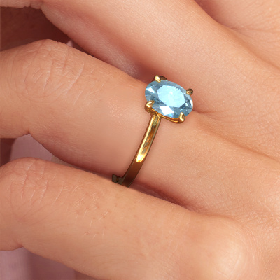 The ring shown above is called the Crystal OVL 1, we call this a solitaire ring because it contains a single gemstone. The engagement ring is made in 14 Carat gold and has a oval blue lab grown diamond of 8x6 mm. The cool thing about our configurator is that you can compile your own piece of jewellery, into a completely personalized one. This solitaire ring is crafted in the precious metals gold with gold, but of course you are free to pick your own colours. Each piece of jewellery is created to add sparkle to your finger, each jewel is lovingly made by hand by our goldsmiths.The solitaire ring is a special type of engagement ring. Its open prong setting allows light to strike the gemstone from various angles. This classic engagement ring is a stunning eye-catcher because of the high positioning of the gemstone. In order for you to commemorate your proposal with a unique ring, we carefully adorn this solitaire ring by hand. The love of your life deserves nothing but the best. Because we design and deliver our own rings, we can offer you a engagement ring at a price you won't find anywhere else. A ring is made to order, which helps prevent excess supplies, so we can make you a great price offer. We understand it feels risky, buying your engagement ring online, but we will gladly assist in the designing process, taking your budget into consideration.Our team adds new designs to our online collection daily. Our designers and goldsmiths work together in creating the best design. We strive to offer a diverse collection of jewels. Perhaps you have a specific jewel design in mind. One you came across somewhere. Please contact us for a free consultation. We will make you an offer, based on a fair price/ quality ratio, that will baffle you.To make it easier for you, we offer a 30 day return policy. Check our terms and conditions.