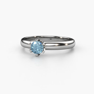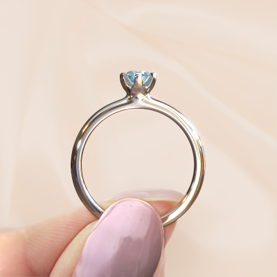In your eyes, no one else compares to her. She is one in a million, unlike anyone else and pure? These qualities are emphasized perfectly by our modern white gold solitaire blue lab grown diamond ring. This blue lab grown diamond is carefully selected by our keen artisan goldsmiths. It equals the unique qualities of the love of your life. There is no better way to memorialize your proposal than this symbol of true love. The ring shown above is called the Lorretta, we call this a solitaire ring because it contains a single gemstone. The engagement ring is made in 14 Carat white gold and has a round blue lab grown diamond of 4.7 mm. Each piece of jewellery is made with passion and love by one of our master goldsmiths.