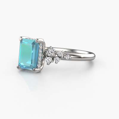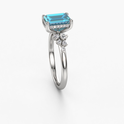 The ring shown above is called the Emma EME. We call this type of ring a pavé solitaire ring because it has one centre gemstone and a band that is also pave set with gemstones. This engagement ring is made in platinum set with a 8x6 mm emerald cut blue topaz, and pave set lab-grown diamonds at the sides. Each piece of jewellery is made with passion and love by one of our master goldsmiths.This fantasy platinum pavé solitaire engagement ring has an exquisite emerald cut blue topaz centre stone. To further accentuate the centre stone, the band is set full with more lab-grown diamonds. Its open prong setting allows light to strike the blue topaz from various angles and this adds sparkle to your blue topaz ring. The photo shown above depicts the goldsmith's carefully handcrafted details of the ring. The high positioning of the centre stone is truly eye-catching. The perfect engagement ring for the crown jewel of your life!After receiving your order, our goldsmiths will passionately start the creative process of making your engagement ring in our own studio. Because we don't have a big stockpile, these costs will not be passed on to you. Our pricing is proof of that! We offer top quality jewels at lowest price, guaranteed.Our team adds new designs to our online collection daily. Our designers and goldsmiths work together in creating the best design. We strive to offer a diverse collection of jewels. Perhaps you have a specific jewel design in mind. One you came across somewhere. Please contact us for a free consultation. We will make you an offer, based on a fair price/ quality ratio, that will baffle you.To make it easier for you, we offer a 30 day return policy. Check our terms and conditions.