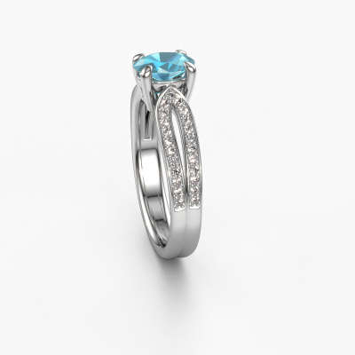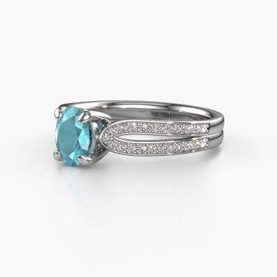 The ring shown above is called the Antonia ovl 2. We call this type of ring a pavé solitaire ring because it has one centre gemstone and a band that is also pave set with gemstones. The platinum engagement ring is set with a oval 7x5 mm blue topaz centre stone and the band is pave set with diamond gemstones. Each jewel is unique in every way! Simply customize to your liking,This contemporary platinum pavé solitaire engagement ring has an exquisite oval blue topaz centre stone. To further accentuate the centre stone, the band is fully set with more diamonds. Its open prong setting allows light to strike the blue topaz from various angles and this adds sparkle to your blue topaz ring. The photo shown above depicts the goldsmith's carefully handcrafted details of the ring. The high positioning of the centre stone is truly eye-catching. The perfect engagement ring for the crown jewel of your life! By using a combination of the latest modern techniques, combined with ancient crafting, we can make all our engagement rings in our own studio. Each jewel is made to order. This is advantageous because we can offer you a price you won't find anywhere else.Our team adds new designs to our online collection daily. Our designers and goldsmiths work together in creating the best design. We strive to offer a diverse collection of jewels. Perhaps you have a specific jewel design in mind. One you came across somewhere. Please contact us for a free consultation. We will make you an offer, based on a fair price/ quality ratio, that will baffle you.To make it easier for you, we offer a 30 day return policy. Check our terms and conditions.