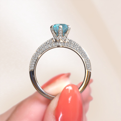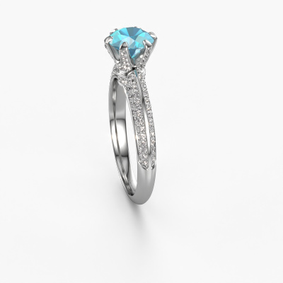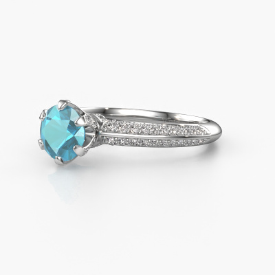 The ring shown above is called the Abby. We call this type of ring a pavé solitaire ring because it has one centre gemstone and a band that is also pave set with gemstones. The platinum engagement ring is set with a round 6.5 mm blue topaz centre stone and the band is pave set with diamond gemstones. Each jewel is made just for you by our master goldsmiths in our own studio.This exclusive platinum pavé solitaire engagement ring has an exquisite round blue topaz centre stone. To further accentuate the centre stone, the band is fully set with more diamonds. Its open prong setting allows light to strike the blue topaz from various angles and this adds sparkle to your blue topaz ring. The photo shown above depicts the goldsmith's carefully handcrafted details of the ring. The high positioning of the centre stone is truly eye-catching. The perfect engagement ring for the crown jewel of your life! Are you on a budget? Please feel free to contact us, so we can go discuss your options. We offer our engagement rings at guaranteed best price, because we make them to order. You won't find such a price anywhere else!Our team adds new designs to our online collection daily. Our designers and goldsmiths work together in creating the best design. We strive to offer a diverse collection of jewels. Perhaps you have a specific jewel design in mind. One you came across somewhere. Please contact us for a free consultation. We will make you an offer, based on a fair price/ quality ratio, that will baffle you.To make it easier for you, we offer a 30 day return policy. Check our terms and conditions.