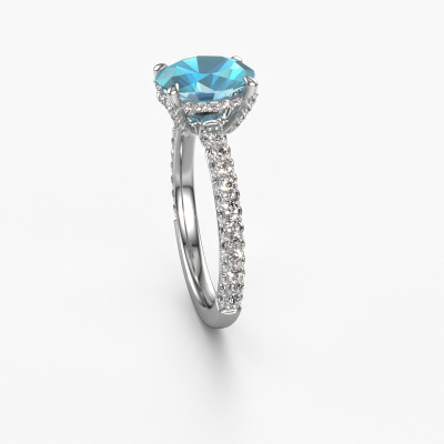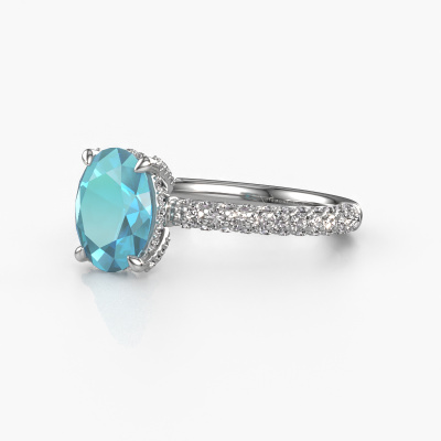 The ring shown above is called the Saskia 2 ovl. We call this type of ring a pavé solitaire ring because it has one centre gemstone and a band that is also pave set with gemstones. The platinum engagement ring is set with a oval 9x7 mm blue topaz centre stone and the band is pave set with lab grown diamond gemstones. Each jewel is made just for you by our master goldsmiths in our own studio.This exclusive platinum pavé solitaire engagement ring has an exquisite oval blue topaz centre stone. To further accentuate the centre stone, the band is fully set with more lab-grown diamonds. Its open prong setting allows light to strike the blue topaz from various angles and this adds sparkle to your blue topaz ring. The photo shown above depicts the goldsmith's carefully handcrafted details of the ring. The high positioning of the centre stone is truly eye-catching. The perfect engagement ring for the crown jewel of your life! After receiving your order, our goldsmiths will passionately start the creative process of making your engagement ring in our own studio. Because we don't have a big stockpile, these costs will not be passed on to you. Our pricing is proof of that! We offer top quality jewels at lowest price, guaranteed.Have you found a specific engagement ring somewhere which you would like to give to your loved one? Please feel free to express your wishes to our jewel designers because we would be honoured to turn your design into a exclusive engagement ring. You can follow the development of your ring design because we use 3D drawings. This gives you a realistic preview of how your design will look. You can also preorder a dummy. A dummy is a plastic ring, which can be shaped according your ring design. You can try it on and check if its width and size are suitable for you. We will gladly send you a non-binding offer, based on a fair price/ quality ratio. It will amaze you, considering the quality of the ring and gemstones.To make it easier for you, we offer a 30 day return policy. Check our terms and conditions.