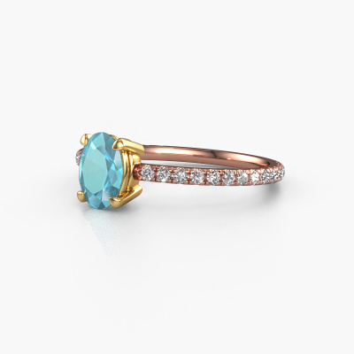 The ring shown above is called the Lynelle 2. We call this type of ring a pavé solitaire ring because it has one centre gemstone and a band that is also pave set with gemstones. This engagement ring is made in 14 Carat rose gold set with a 7x5 mm oval blue topaz, and pave set diamonds at the sides. Each piece of jewellery is created to add sparkle to your finger, each jewel is lovingly made by hand by our goldsmiths.This classic rose gold pavé solitaire engagement ring has an exquisite oval blue topaz centre stone. To further accentuate the centre stone, the band is set full with more diamonds. Its open prong setting allows light to strike the blue topaz from various angles and this adds sparkle to your blue topaz ring. The photo shown above depicts the goldsmith's carefully handcrafted details of the ring. The high positioning of the centre stone is truly eye-catching. The perfect engagement ring for the crown jewel of your life!After receiving your order, our goldsmiths will start the creative process of making your Lynelle 2 engagement ring. We don't keep stock. This is advantageous because these costs will not be passed on to you. Therefore, we can offer jewellery at exceptionally low prices.Do you have a specific ring in mind? One you came across somewhere. Please feel free to tell us your wishes and we will turn your design into a unique engagement ring. You can follow the development of your ring design because we use 3D drawings. This gives you a realistic preview of your design. We will gladly send you a non-binding offer, based on a fair price/ quality ratio. It will amaze you.To make it easier for you, we offer a 30 day return policy. Check our terms and conditions.