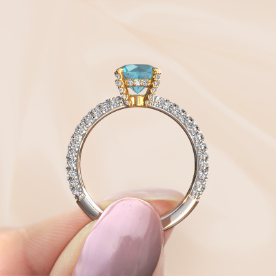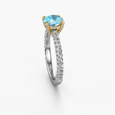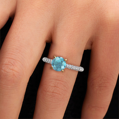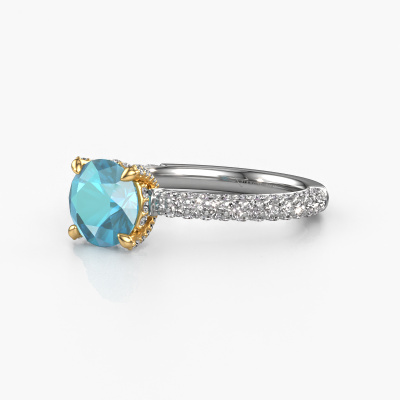 The ring shown above is called the Saskia rnd 2. We call this type of ring a pavé solitaire ring because it has one centre gemstone and a band that is also pave set with gemstones. The 14 Carat white gold engagement ring is set with a round 7 mm blue topaz centre stone and the band is pave set with lab grown diamond gemstones. Each jewel is made by a team of passionate goldsmiths and jewel designers. This will make your crown jewel truly eye-catching.This exclusive white gold pavé solitaire engagement ring has an exquisite round blue topaz centre stone. To further accentuate the centre stone, the band is fully set with more lab-grown diamonds. Its open prong setting allows light to strike the blue topaz from various angles and this adds sparkle to your blue topaz ring. The photo shown above depicts the goldsmith's carefully handcrafted details of the ring. The high positioning of the centre stone is truly eye-catching. The perfect engagement ring for the crown jewel of your life! After receiving your order, our goldsmiths will passionately start the creative process of making your engagement ring in our own studio. Because we don't have a big stockpile, these costs will not be passed on to you. Our pricing is proof of that! We offer top quality jewels at lowest price, guaranteed.Our team adds new designs to our online collection daily. Our designers and goldsmiths work together in creating the best design. We strive to offer a diverse collection of jewels. Perhaps you have a specific jewel design in mind. One you came across somewhere. Please contact us for a free consultation. We will make you an offer, based on a fair price/ quality ratio, that will baffle you.To make it easier for you, we offer a 30 day return policy. Check our terms and conditions.
