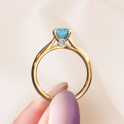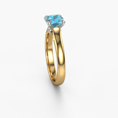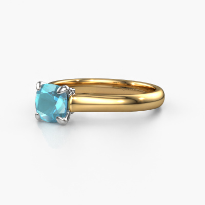 The ring shown above is called the Valorie cus 1, we call this a solitaire ring because it contains a single gemstone. The engagement ring is made in 14 Carat gold and has a cushion blue topaz of 6 mm. The cool thing about our configurator is that you can compile your own piece of jewellery, into a completely personalized one. This solitaire ring is crafted in the precious metals gold with white gold, but of course you are free to pick your own colours. Each piece of jewellery is made to shine bright around your finger. Each jewel is hand made with love by our goldsmiths.The solitaire ring is a special type of engagement ring. Its open prong setting allows light to strike the gemstone from various angles. This classic engagement ring is a stunning eye-catcher because of the high positioning of the gemstone. In order for you to commemorate your proposal with a unique ring, we carefully adorn this solitaire ring by hand. The love of your life deserves nothing but the best. Are you on a budget? Please feel free to contact us, so we can go discuss your options. We offer our engagement rings at guaranteed best price, because we make them to order. You won't find such a price anywhere else!Have you found a specific engagement ring somewhere which you would like to give to your loved one? Please feel free to express your wishes to our jewel designers because we would be honoured to turn your design into a classic engagement ring. You can follow the development of your ring design because we use 3D drawings. This gives you a realistic preview of how your design will look. You can also preorder a dummy. A dummy is a plastic ring, which can be shaped according your ring design. You can try it on and check if its width and size are suitable for you. We will gladly send you a non-binding offer, based on a fair price/ quality ratio. It will amaze you, considering the quality of the ring and gemstones.To make it easier for you, we offer a 30 day return policy. Check our terms and conditions.
