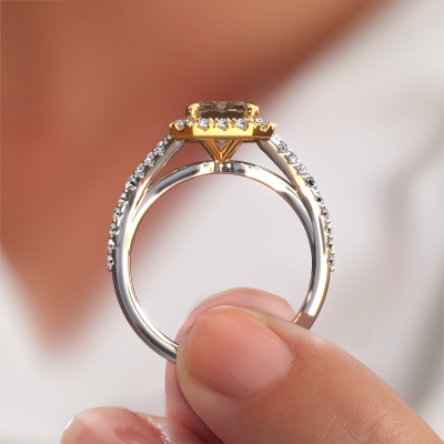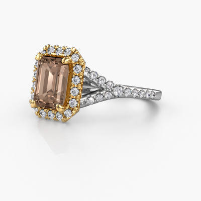 The ring shown above is called the Kimber EME. We call this type of ring a pavé solitaire ring because it has one centre gemstone and a band that is also pave set with gemstones. The 14 Carat white gold engagement ring is set with a emerald cut 1.75 crt brown diamond centre stone and the band is pave set with lab grown diamond gemstones. Each jewel is made by a team of passionate goldsmiths and jewel designers. This will make your crown jewel truly eye-catching.This exclusive white gold pavé solitaire engagement ring has an exquisite emerald cut brown diamond centre stone. To further accentuate the centre stone, the band is fully set with more lab-grown diamonds. Its open prong setting allows light to strike the brown diamond from various angles and this adds sparkle to your brown diamond ring. The photo shown above depicts the goldsmith's carefully handcrafted details of the ring. The high positioning of the centre stone is truly eye-catching. The perfect engagement ring for the crown jewel of your life! By using a combination of the latest modern techniques, combined with ancient crafting, we can make all our engagement rings in our own studio. Each jewel is made to order. This is advantageous because we can offer you a price you won't find anywhere else.Our team adds new designs to our online collection daily. Our designers and goldsmiths work together in creating the best design. We strive to offer a diverse collection of jewels. Perhaps you have a specific jewel design in mind. One you came across somewhere. Please contact us for a free consultation. We will make you an offer, based on a fair price/ quality ratio, that will baffle you.To make it easier for you, we offer a 30 day return policy. Check our terms and conditions.