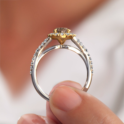 The ring shown above is called the Kimber OVL. We call this type of ring a pavé solitaire ring because it has one centre gemstone and a band that is also pave set with gemstones. The 14 Carat white gold engagement ring is set with a oval 1.10 crt brown diamond centre stone and the band is pave set with lab grown diamond gemstones. Each jewel is made with passion and love by one of our master goldsmiths.This exclusive white gold pavé solitaire engagement ring has an exquisite oval brown diamond centre stone. To further accentuate the centre stone, the band is fully set with more lab-grown diamonds. Its open prong setting allows light to strike the brown diamond from various angles and this adds sparkle to your brown diamond ring. The photo shown above depicts the goldsmith's carefully handcrafted details of the ring. The high positioning of the centre stone is truly eye-catching. The perfect engagement ring for the crown jewel of your life! By using a combination of the latest modern techniques, combined with ancient crafting, we can make all our engagement rings in our own studio. Each jewel is made to order. This is advantageous because we can offer you a price you won't find anywhere else.Our team adds new designs to our online collection daily. Our designers and goldsmiths work together in creating the best design. We strive to offer a diverse collection of jewels. Perhaps you have a specific jewel design in mind. One you came across somewhere. Please contact us for a free consultation. We will make you an offer, based on a fair price/ quality ratio, that will baffle you.To make it easier for you, we offer a 30 day return policy. Check our terms and conditions.