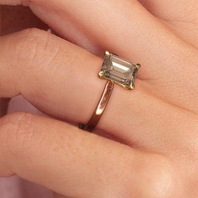 The ring shown above is called the Crystal EME 1, we call this a solitaire ring because it contains a single gemstone. The engagement ring is made in 14 Carat rose gold and has a emerald cut brown diamond of 1.75 crt. The cool thing about our configurator is that you can compile your own piece of jewellery, into a completely personalized one. This solitaire ring is crafted in the precious metals rose gold with gold, but of course you are free to pick your own colours. Each piece of jewellery is made with passion and love by one of our master goldsmiths.The solitaire ring is a special type of engagement ring. Its open prong setting allows light to strike the gemstone from various angles. This classic engagement ring is a stunning eye-catcher because of the high positioning of the gemstone. In order for you to commemorate your proposal with a unique ring, we carefully adorn this solitaire ring by hand. The love of your life deserves nothing but the best. After receiving your order, our goldsmiths will passionately start the creative process of making your engagement ring in our own studio. Because we don't have a big stockpile, these costs will not be passed on to you. Our pricing is proof of that! We offer top quality jewels at lowest price, guaranteed.Our designers and goldsmiths work together each day, creating new jewels. Perhaps you have found a nice classic engagement ring somewhere, which can be used to customize your unique ring. Please feel free to contact us. We will make you an offer, based on a fair price/ quality ratio, which will amaze you.To make it easier for you, we offer a 30 day return policy. Check our terms and conditions.
