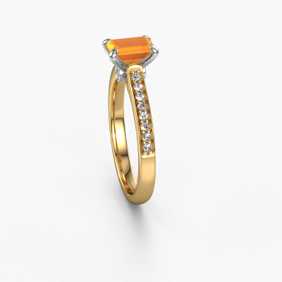 The ring shown above is called the Valorie eme 2. We call this type of ring a pavé solitaire ring because it has one centre gemstone and a band that is also pave set with gemstones. The 14 Carat gold engagement ring is set with a emerald cut 6.5x4.5 mm citrin centre stone and the band is pave set with diamond gemstones. Each jewel is made by a team of passionate goldsmiths and jewel designers. This will make your crown jewel truly eye-catching.This classic gold pavé solitaire engagement ring has an exquisite emerald cut citrin centre stone. To further accentuate the centre stone, the band is fully set with more diamonds. Its open prong setting allows light to strike the citrin from various angles and this adds sparkle to your citrin ring. The photo shown above depicts the goldsmith's carefully handcrafted details of the ring. The high positioning of the centre stone is truly eye-catching. The perfect engagement ring for the crown jewel of your life! By using our modern techniques, we can design and customize the finest quality jewels with the utmost care for you. Our engagement rings are always priced 30 percent lower than other jewellers. We make engagement rings to order so we don't have to maintain a large stock. If you have a certain budget, we are more than happy to advice you accordingly.Have you found a specific engagement ring somewhere which you would like to give to your loved one? Please feel free to express your wishes to our jewel designers because we would be honoured to turn your design into a classic engagement ring. You can follow the development of your ring design because we use 3D drawings. This gives you a realistic preview of how your design will look. You can also preorder a dummy. A dummy is a plastic ring, which can be shaped according your ring design. You can try it on and check if its width and size are suitable for you. We will gladly send you a non-binding offer, based on a fair price/ quality ratio. It will amaze you, considering the quality of the ring and gemstones.To make it easier for you, we offer a 30 day return policy. Check our terms and conditions.