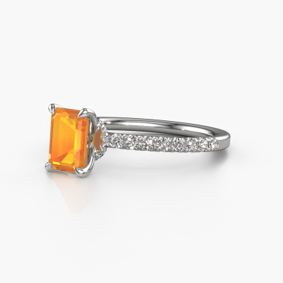 The ring shown above is called the Crystal EME 4. We call this type of ring a pavé solitaire ring because it has one centre gemstone and a band that is also pave set with gemstones. The platinum engagement ring is set with a emerald cut 7x5 mm citrin centre stone and the band is pave set with lab grown diamond gemstones. Each jewel is created to add sparkle to your finger, each jewel is lovingly made by hand by our goldsmiths.This fashionable platinum pavé solitaire engagement ring has an exquisite emerald cut citrin centre stone. To further accentuate the centre stone, the band is fully set with more lab-grown diamonds. Its open prong setting allows light to strike the citrin from various angles and this adds sparkle to your citrin ring. The photo shown above depicts the goldsmith's carefully handcrafted details of the ring. The high positioning of the centre stone is truly eye-catching. The perfect engagement ring for the crown jewel of your life! After receiving your order, our goldsmiths will passionately start the creative process of making your engagement ring in our own studio. Because we don't have a big stockpile, these costs will not be passed on to you. Our pricing is proof of that! We offer top quality jewels at lowest price, guaranteed.Our team adds new designs to our online collection daily. Our designers and goldsmiths work together in creating the best design. We strive to offer a diverse collection of jewels. Perhaps you have a specific jewel design in mind. One you came across somewhere. Please contact us for a free consultation. We will make you an offer, based on a fair price/ quality ratio, that will baffle you.To make it easier for you, we offer a 30 day return policy. Check our terms and conditions.