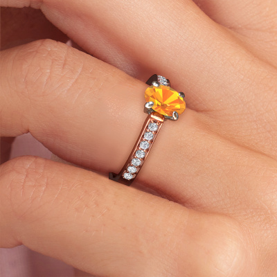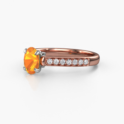 The ring shown above is called the Valorie ovl 2. We call this type of ring a pavé solitaire ring because it has one centre gemstone and a band that is also pave set with gemstones. This engagement ring is made in 14 Carat rose gold set with a 7x5 mm oval citrin, and pave set lab-grown diamonds at the sides. Each piece of jewellery is made with passion and love by one of our master goldsmiths.This fashionable rose gold pavé solitaire engagement ring has an exquisite oval citrin centre stone. To further accentuate the centre stone, the band is set full with more lab-grown diamonds. Its open prong setting allows light to strike the citrin from various angles and this adds sparkle to your citrin ring. The photo shown above depicts the goldsmith's carefully handcrafted details of the ring. The high positioning of the centre stone is truly eye-catching. The perfect engagement ring for the crown jewel of your life!Are you on a budget? Please feel free to contact us, so we can go discuss your options. We offer our engagement rings at guaranteed best price, because we make them to order. You won't find such a price anywhere else!Our team adds new designs to our online collection daily. Our designers and goldsmiths work together in creating the best design. We strive to offer a diverse collection of jewels. Perhaps you have a specific jewel design in mind. One you came across somewhere. Please contact us for a free consultation. We will make you an offer, based on a fair price/ quality ratio, that will baffle you.To make it easier for you, we offer a 30 day return policy. Check our terms and conditions.