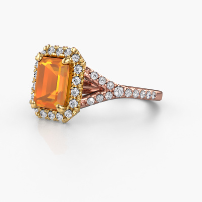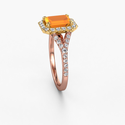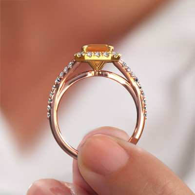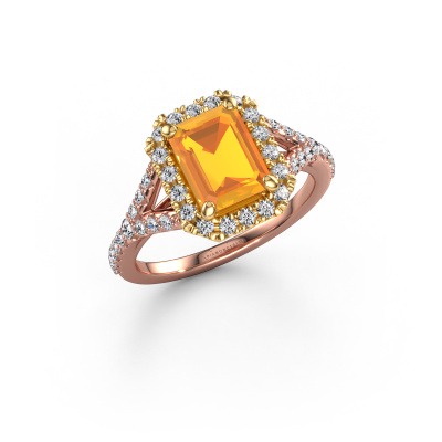 The ring shown above is called the Kimber EME. We call this type of ring a pavé solitaire ring because it has one centre gemstone and a band that is also pave set with gemstones. The 14 Carat rose gold engagement ring is set with a emerald cut 8x6 mm citrin centre stone and the band is pave set with lab grown diamond gemstones. Each jewel is made by a team of passionate goldsmiths and jewel designers. This will make your crown jewel truly eye-catching.This exclusive rose gold pavé solitaire engagement ring has an exquisite emerald cut citrin centre stone. To further accentuate the centre stone, the band is fully set with more lab-grown diamonds. Its open prong setting allows light to strike the citrin from various angles and this adds sparkle to your citrin ring. The photo shown above depicts the goldsmith's carefully handcrafted details of the ring. The high positioning of the centre stone is truly eye-catching. The perfect engagement ring for the crown jewel of your life! By using a combination of the latest modern techniques, combined with ancient crafting, we can make all our engagement rings in our own studio. Each jewel is made to order. This is advantageous because we can offer you a price you won't find anywhere else.Our team adds new designs to our online collection daily. Our designers and goldsmiths work together in creating the best design. We strive to offer a diverse collection of jewels. Perhaps you have a specific jewel design in mind. One you came across somewhere. Please contact us for a free consultation. We will make you an offer, based on a fair price/ quality ratio, that will baffle you.To make it easier for you, we offer a 30 day return policy. Check our terms and conditions.