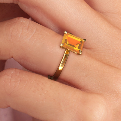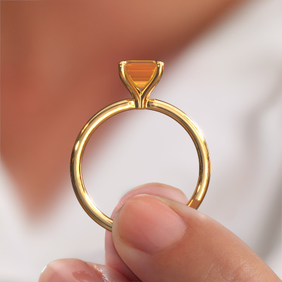 The ring shown above is called the Crystal EME 1, we call this a solitaire ring because it contains a single gemstone. The engagement ring is made in 14 Carat gold and has a emerald cut citrin of 8x6 mm. The cool thing about our configurator is that you can compile your own piece of jewellery, into a completely personalized one. This solitaire ring is crafted in the precious metals gold with gold, but of course you are free to pick your own colours. Each piece of jewellery is made with passion and love by one of our master goldsmiths.The solitaire ring is a special type of engagement ring. Its open prong setting allows light to strike the gemstone from various angles. This classic engagement ring is a stunning eye-catcher because of the high positioning of the gemstone. In order for you to commemorate your proposal with a unique ring, we carefully adorn this solitaire ring by hand. The love of your life deserves nothing but the best. After receiving your order, our goldsmiths will passionately start the creative process of making your engagement ring in our own studio. Because we don't have a big stockpile, these costs will not be passed on to you. Our pricing is proof of that! We offer top quality jewels at lowest price, guaranteed.Our designers and goldsmiths work together each day, creating new jewels. Perhaps you have found a nice classic engagement ring somewhere, which can be used to customize your unique ring. Please feel free to contact us. We will make you an offer, based on a fair price/ quality ratio, which will amaze you.To make it easier for you, we offer a 30 day return policy. Check our terms and conditions.
