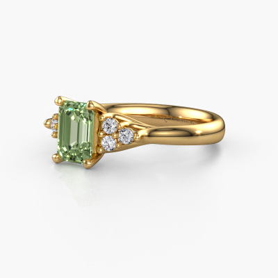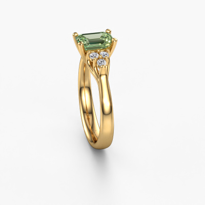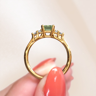 The ring shown above is called the Monika EME. We call this a solitaire ring because it contains a single gemstone. The engagement ring is made in 14 Carat gold and has a emerald cut green lab grown diamond of 7x5 mm. This extraordinary classic gold solitaire engagement ring is set with a beautiful emerald cut green lab grown diamond to add sparkle to your proposal. The open prong setting allows light to strike the gemstone from various angles. Did you know a diamond represents everlasting love and fidelity? This makes it a perfect centrepiece. Our goldsmith carefully positions the gemstone of your choosing high on top of the ring, which makes it stand out. Each piece of jewellery is made just for you by our master goldsmiths in our own studio.By using our modern techniques, we can design and customize the finest quality jewels with the utmost care for you. Our engagement rings are always priced 30 percent lower than other jewellers. We make engagement rings to order so we don't have to maintain a large stock. If you have a certain budget, we are more than happy to advice you accordingly.Our team adds new designs to our online collection daily. Our designers and goldsmiths work together in creating the best design. We strive to offer a diverse collection of jewels. Perhaps you have a specific jewel design in mind. One you came across somewhere. Please contact us for a free consultation. We will make you an offer, based on a fair price/ quality ratio, that will baffle you.To make it easier for you, we offer a 30 day return policy. Check our terms and conditions.