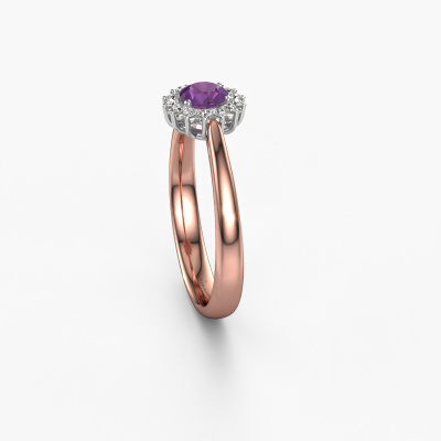 The ring shown above is called the Tilly RND 1. We call this type of ring a cluster ring. The centre gemstone is surrounded by smaller sized stones. This 14 Carat rose gold version is set with a 4.2 mm round amethyst centre stone, embraced by smaller diamonds. What makes this classic rose gold cluster ring special is the setting of the smaller gems surrounding the centre amethyst, which are shaped like a beautiful flower. The surrounding cluster of stones frame the middle centre stone in such a way to make it appear bigger. This type of engagement ring is also called a flower ring. It is very important that the smaller diamonds are positioned identically so there is no interference of light but perfect unity instead. Our skilled Goldsmiths get the job done. Each individual stone is carefully set by hand. During manufacturing, light fall is constantly monitored to make sure the special cluster effect is still visible. In the end you get the perfect engagement ring with a radiant amethyst gemstone centrepiece. You can imagine the effect of a ring of such significance when you give tot the love of your life on her special day to shine. This jewel is made to shine bright around your finger. Each jewel is hand made with love by our goldsmiths.By using a combination of the latest modern techniques, combined with ancient crafting, we can make all our engagement rings in our own studio. Each jewel is made to order. This is advantageous because we can offer you a price you won't find anywhere else.Our team adds new designs to our online collection daily. Our designers and goldsmiths work together in creating the best design. We strive to offer a diverse collection of jewels. Perhaps you have a specific jewel design in mind. One you came across somewhere. Please contact us for a free consultation. We will make you an offer, based on a fair price/ quality ratio, that will baffle you.To make it easier for you, we offer a 30 day return policy. Check our terms and conditions.