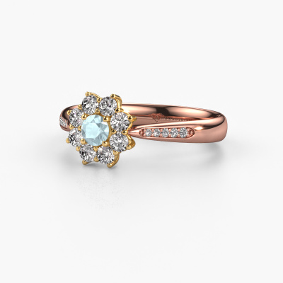 The ring shown above is called the Carolyn 2. We call this type of ring a cluster ring. The centre gemstone is surrounded by smaller sized stones. This 14 Carat rose gold version is set with a 3.4 mm round aquamarine centre stone, embraced by smaller diamonds. What makes this traditional rose gold cluster ring special is the setting of the smaller gems surrounding the centre aquamarine, which are shaped like a beautiful flower. The surrounding cluster of stones frame the middle centre stone in such a way to make it appear bigger. This type of engagement ring is also called a flower ring. It is very important that the smaller diamonds are positioned identically so there is no interference of light but perfect unity instead. Our skilled Goldsmiths get the job done. Each individual stone is carefully set by hand. During manufacturing, light fall is constantly monitored to make sure the special cluster effect is still visible. In the end you get the perfect engagement ring with a radiant aquamarine gemstone centrepiece. You can imagine the effect of a ring of such significance when you give tot the love of your life on her special day to shine. This jewel is unique in every way! Simply customize to your liking,Are you on a budget? Please feel free to contact us, so we can go discuss your options. We offer our engagement rings at guaranteed best price, because we make them to order. You won't find such a price anywhere else!Our team adds new designs to our online collection daily. Our designers and goldsmiths work together in creating the best design. We strive to offer a diverse collection of jewels. Perhaps you have a specific jewel design in mind. One you came across somewhere. Please contact us for a free consultation. We will make you an offer, based on a fair price/ quality ratio, that will baffle you.To make it easier for you, we offer a 30 day return policy. Check our terms and conditions.