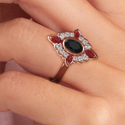 This 14 Carat rose gold ring is called Door and is set with 1.342 crt black diamond. An extraordinary rose gold vintage ring. One that will surely make the love of your life shine like a diamond! That is what we hope to achieve. This vintage engagement ring is set with exquisite black diamond. Whichever gemstone you choose from our selection, is up to you. The gemstone is selected with great care because we believe your daring engagement ring must be adorned with nothing but the most beautiful gemstone. Wouldn't you agree? Our expert goldsmith will design your ring in our own crafting studio, where the black diamond will be set with great precision. The ring will then be polished till it shines perfectly. Nothing but the best for the love of your life! This jewel is made just for you by our master goldsmiths in our own studio.After receiving your order, our goldsmiths will passionately start the creative process of making your engagement ring in our own studio. Because we don't have a big stockpile, these costs will not be passed on to you. Our pricing is proof of that! We offer top quality jewels at lowest price, guaranteed.Our team adds new designs to our online collection daily. Our designers and goldsmiths work together in creating the best design. We strive to offer a diverse collection of jewels. Perhaps you have a specific jewel design in mind. One you came across somewhere. Please contact us for a free consultation. We will make you an offer, based on a fair price/ quality ratio, that will baffle you.To make it easier for you, we offer a 30 day return policy. Check our terms and conditions.