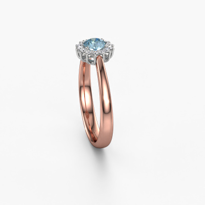 The ring shown above is called the Tilly RND 1. We call this type of ring a cluster ring. The centre gemstone is surrounded by smaller sized stones. This 14 Carat rose gold version is set with a 4.2 mm round blue lab grown diamond centre stone, embraced by smaller diamonds. What makes this classic rose gold cluster ring special is the setting of the smaller gems surrounding the centre blue lab grown diamond, which are shaped like a beautiful flower. The surrounding cluster of stones frame the middle centre stone in such a way to make it appear bigger. This type of engagement ring is also called a flower ring. It is very important that the smaller diamonds are positioned identically so there is no interference of light but perfect unity instead. Our skilled Goldsmiths get the job done. Each individual stone is carefully set by hand. During manufacturing, light fall is constantly monitored to make sure the special cluster effect is still visible. In the end you get the perfect engagement ring with a radiant blue lab grown diamond gemstone centrepiece. You can imagine the effect of a ring of such significance when you give tot the love of your life on her special day to shine. This jewel is made to shine bright around your finger. Each jewel is hand made with love by our goldsmiths.