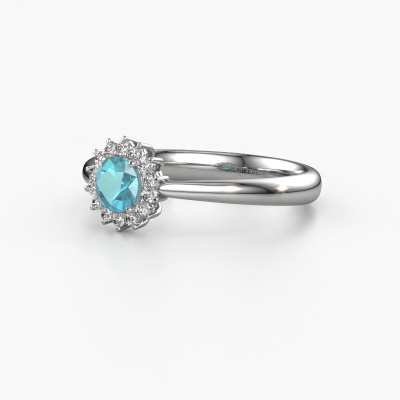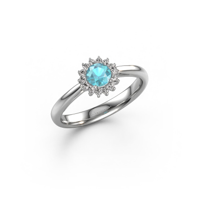 The ring shown above is called the Tilly RND 1. We call this type of ring a cluster ring. The centre gemstone is surrounded by smaller sized stones. This 14 Carat white gold version is set with a 4.2 mm round blue topaz centre stone, embraced by smaller diamonds. What makes this classic white gold cluster ring special is the setting of the smaller gems surrounding the centre blue topaz, which are shaped like a beautiful flower. The surrounding cluster of stones frame the middle centre stone in such a way to make it appear bigger. This type of engagement ring is also called a flower ring. It is very important that the smaller diamonds are positioned identically so there is no interference of light but perfect unity instead. Our skilled Goldsmiths get the job done. Each individual stone is carefully set by hand. During manufacturing, light fall is constantly monitored to make sure the special cluster effect is still visible. In the end you get the perfect engagement ring with a radiant blue topaz gemstone centrepiece. You can imagine the effect of a ring of such significance when you give tot the love of your life on her special day to shine. This jewel is made to shine bright around your finger. Each jewel is hand made with love by our goldsmiths.By using a combination of the latest modern techniques, combined with ancient crafting, we can make all our engagement rings in our own studio. Each jewel is made to order. This is advantageous because we can offer you a price you won't find anywhere else.Our team adds new designs to our online collection daily. Our designers and goldsmiths work together in creating the best design. We strive to offer a diverse collection of jewels. Perhaps you have a specific jewel design in mind. One you came across somewhere. Please contact us for a free consultation. We will make you an offer, based on a fair price/ quality ratio, that will baffle you.To make it easier for you, we offer a 30 day return policy. Check our terms and conditions.