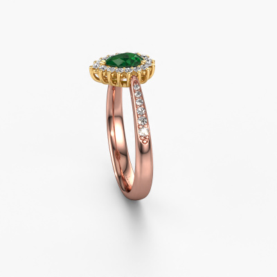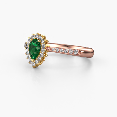 The ring shown above is called the Tilly per 2. We call this type of ring a cluster ring. The centre gemstone is surrounded by smaller sized stones. This 14 Carat rose gold version is set with a 6x4 mm pear emerald centre stone, embraced by smaller diamonds. What makes this exclusive rose gold cluster ring special is the setting of the smaller gems surrounding the centre emerald, which are shaped like a beautiful flower. The surrounding cluster of stones frame the middle centre stone in such a way to make it appear bigger. This type of engagement ring is also called a flower ring. It is very important that the smaller diamonds are positioned identically so there is no interference of light but perfect unity instead. Our skilled Goldsmiths get the job done. Each individual stone is carefully set by hand. During manufacturing, light fall is constantly monitored to make sure the special cluster effect is still visible. In the end you get the perfect engagement ring with a radiant emerald gemstone centrepiece. You can imagine the effect of a ring of such significance when you give tot the love of your life on her special day to shine. This jewel is made just for you, with attention to detail and design.After receiving your order, our goldsmiths will passionately start the creative process of making your engagement ring in our own studio. Because we don't have a big stockpile, these costs will not be passed on to you. Our pricing is proof of that! We offer top quality jewels at lowest price, guaranteed.Different styles of new rings are made daily by our team. Perhaps you have found a cluster engagement ring somewhere. One you would like to give to your loved one. Please feel free to share your thoughts and design with our jewel designers. We would love to turn your design into a exclusive engagement ring. You can follow the development of your ring design because we use very detailed 3D drawings. On top of that, you can order a dummy of the design. A dummy is a plastic ring, which can be shaped according your ring design. You can try it on and check if the engagement ring is up to standard. We will gladly send you a non-binding offer, based on a fair price/ quality ratio. The offer will baffle you, considering the quality of the ring and gemstones.To make it easier for you, we offer a 30 day return policy. Check our terms and conditions.