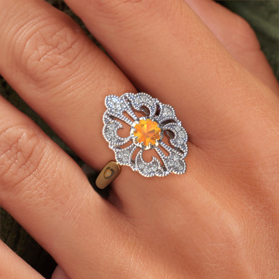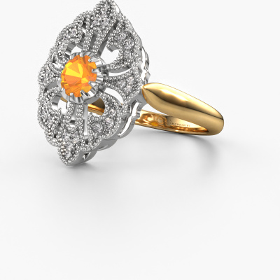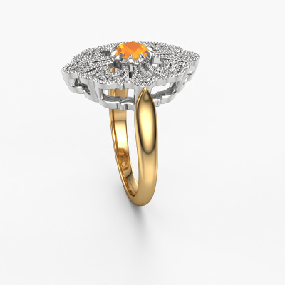 This 14 Carat gold ring is called Naida and is set with 5 mm citrin. Is your girlfriend hooked on vintage? Then this gold graceful engagement ring will surely match her style perfectly. A trendy ring with just a hint of vintage adornment. A truly stunning, romantic design! Especially when you customize your ring to your own liking. This vintage cluster engagement ring is set with stunning citrin. As you can see, you are the boss in selecting a gemstone which matches the style of your girlfriend best. Each gemstone is carefully selected by our merchants whom are spread throughout the world. Nothing but the best gems for our expert goldsmith. After all, it is his crowning glory! Each jewel is made just for you by our master goldsmiths in our own studio.By using a combination of the latest modern techniques, combined with ancient crafting, we can make all our engagement rings in our own studio. Each jewel is made to order. This is advantageous because we can offer you a price you won't find anywhere else.Do you have a specific ring in mind? One you came across somewhere. Please feel free to tell us your wishes and we will turn your design into a unique engagement ring. You can follow the development of your ring design because we use 3D drawings. This gives you a realistic preview of your design. We will gladly send you a non-binding offer, based on a fair price/ quality ratio. It will amaze you.To make it easier for you, we offer a 30 day return policy. Check our terms and conditions.