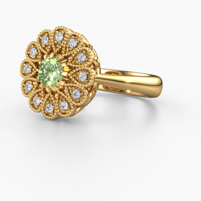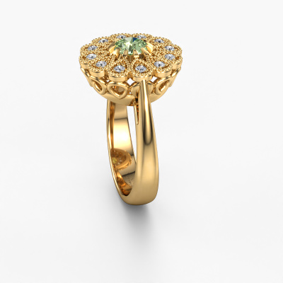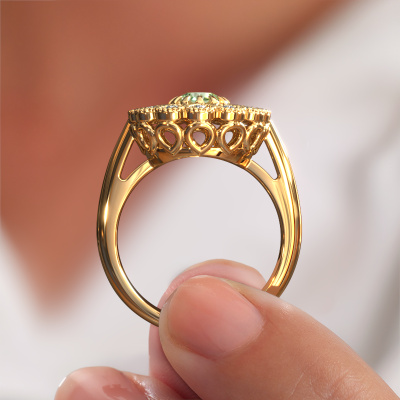 This 14 Carat gold ring is called Kaat and is set with 5 mm green lab grown diamond. Is your girlfriend hooked on vintage? Then this gold pearl edges engagement ring will surely match her style perfectly. A trendy ring with just a hint of vintage adornment. A truly stunning, romantic design! Especially when you customize your ring to your own liking. This vintage cluster engagement ring is set with stunning green lab grown diamonds. As you can see, you are the boss in selecting a gemstone which matches the style of your girlfriend best. Each gemstone is carefully selected by our merchants whom are spread throughout the world. Nothing but the best gems for our expert goldsmith. After all, it is his crowning glory! Each jewel is created to add sparkle to your finger, each jewel is lovingly made by hand by our goldsmiths.Because we design and deliver our own rings, we can offer you a engagement ring at a price you won't find anywhere else. A ring is made to order, which helps prevent excess supplies, so we can make you a great price offer. We understand it feels risky, buying your engagement ring online, but we will gladly assist in the designing process, taking your budget into consideration.Our team adds new designs to our online collection daily. Our designers and goldsmiths work together in creating the best design. We strive to offer a diverse collection of jewels. Perhaps you have a specific jewel design in mind. One you came across somewhere. Please contact us for a free consultation. We will make you an offer, based on a fair price/ quality ratio, that will baffle you.To make it easier for you, we offer a 30 day return policy. Check our terms and conditions.