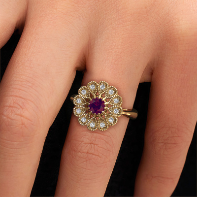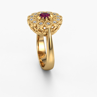 This 14 Carat gold ring is called Kaat and is set with 5 mm rhodolite. Is your girlfriend hooked on vintage? Then this gold pearl edges engagement ring will surely match her style perfectly. A trendy ring with just a hint of vintage adornment. A truly stunning, romantic design! Especially when you customize your ring to your own liking. This vintage cluster engagement ring is set with stunning rhodolite. As you can see, you are the boss in selecting a gemstone which matches the style of your girlfriend best. Each gemstone is carefully selected by our merchants whom are spread throughout the world. Nothing but the best gems for our expert goldsmith. After all, it is his crowning glory! Each jewel is created to add sparkle to your finger, each jewel is lovingly made by hand by our goldsmiths.Because we design and deliver our own rings, we can offer you a engagement ring at a price you won't find anywhere else. A ring is made to order, which helps prevent excess supplies, so we can make you a great price offer. We understand it feels risky, buying your engagement ring online, but we will gladly assist in the designing process, taking your budget into consideration.Our team adds new designs to our online collection daily. Our designers and goldsmiths work together in creating the best design. We strive to offer a diverse collection of jewels. Perhaps you have a specific jewel design in mind. One you came across somewhere. Please contact us for a free consultation. We will make you an offer, based on a fair price/ quality ratio, that will baffle you.To make it easier for you, we offer a 30 day return policy. Check our terms and conditions.