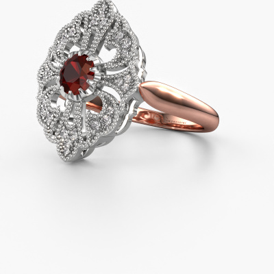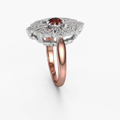 This 14 Carat rose gold ring is called Naida and is set with 5 mm garnet. Is your girlfriend hooked on vintage? Then this rose gold graceful engagement ring will surely match her style perfectly. A trendy ring with just a hint of vintage adornment. A truly stunning, romantic design! Especially when you customize your ring to your own liking. This vintage cluster engagement ring is set with stunning garnet. As you can see, you are the boss in selecting a gemstone which matches the style of your girlfriend best. Each gemstone is carefully selected by our merchants whom are spread throughout the world. Nothing but the best gems for our expert goldsmith. After all, it is his crowning glory! Each jewel is made just for you by our master goldsmiths in our own studio.By using a combination of the latest modern techniques, combined with ancient crafting, we can make all our engagement rings in our own studio. Each jewel is made to order. This is advantageous because we can offer you a price you won't find anywhere else.Do you have a specific ring in mind? One you came across somewhere. Please feel free to tell us your wishes and we will turn your design into a unique engagement ring. You can follow the development of your ring design because we use 3D drawings. This gives you a realistic preview of your design. We will gladly send you a non-binding offer, based on a fair price/ quality ratio. It will amaze you.To make it easier for you, we offer a 30 day return policy. Check our terms and conditions.