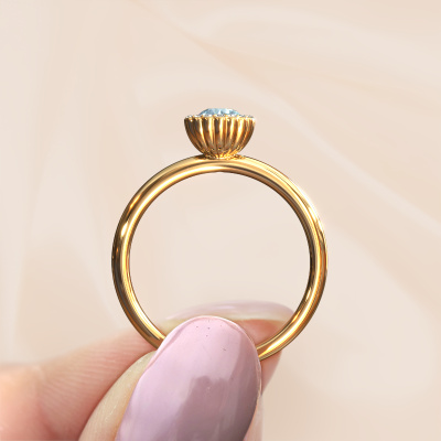 This 14 Carat gold ring is called Queen and is set with 4.2 mm blue lab grown diamond. For you, there is only one person in your life who stands out in a crowd. Only one that makes your heart skip a beat. A true gem! She, above all others, deserves a special gift. A unique customized jewel made in her honour. We believe this ring is perfect for your special moment. Each detail of this exclusive gold cluster engagement ring is selected by hand, crafted and polished by our expert goldsmith in our own artisan studio. We strive to achieve the perfect design and composition of the ring, so it enhances the unique features of our blue lab grown diamonds, and lets them shine even brighter. It takes a lot of precision to make but in the end it pays off because of the sheer beauty of the ring. And that is our main goal. It's what gets us excited. The great thing about our online tool is, that you can design your own jewellery into a unique, personalized piece. This unique charming engagement ring is created with the precious metal combination of gold and gold. But of course you are completely free to select other colours. Each piece of jewellery is made just for you by our master goldsmiths in our own studio.