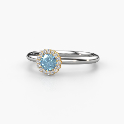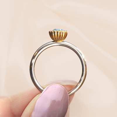 This 14 Carat white gold ring is called Queen and is set with 4.2 mm blue lab grown diamond. For you, there is only one person in your life who stands out in a crowd. Only one that makes your heart skip a beat. A true gem! She, above all others, deserves a special gift. A unique customized jewel made in her honour. We believe this ring is perfect for your special moment. Each detail of this exclusive white gold cluster engagement ring is selected by hand, crafted and polished by our expert goldsmith in our own artisan studio. We strive to achieve the perfect design and composition of the ring, so it enhances the unique features of our blue lab grown diamonds, and lets them shine even brighter. It takes a lot of precision to make but in the end it pays off because of the sheer beauty of the ring. And that is our main goal. It's what gets us excited. The great thing about our online tool is, that you can design your own jewellery into a unique, personalized piece. This unique charming engagement ring is created with the precious metal combination of white gold and gold. But of course you are completely free to select other colours. Each piece of jewellery is made just for you by our master goldsmiths in our own studio.