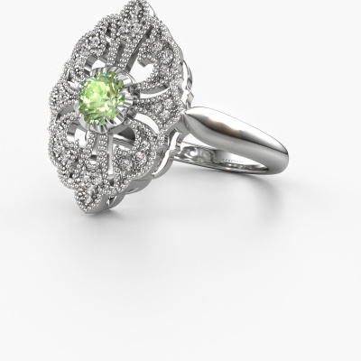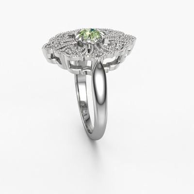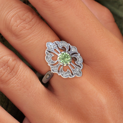 This 14 Carat white gold ring is called Naida and is set with 5 mm green lab grown diamond. Is your girlfriend hooked on vintage? Then this white gold graceful engagement ring will surely match her style perfectly. A trendy ring with just a hint of vintage adornment. A truly stunning, romantic design! Especially when you customize your ring to your own liking. This vintage cluster engagement ring is set with stunning green lab grown diamonds. As you can see, you are the boss in selecting a gemstone which matches the style of your girlfriend best. Each gemstone is carefully selected by our merchants whom are spread throughout the world. Nothing but the best gems for our expert goldsmith. After all, it is his crowning glory! Each jewel is made just for you by our master goldsmiths in our own studio.By using a combination of the latest modern techniques, combined with ancient crafting, we can make all our engagement rings in our own studio. Each jewel is made to order. This is advantageous because we can offer you a price you won't find anywhere else.Do you have a specific ring in mind? One you came across somewhere. Please feel free to tell us your wishes and we will turn your design into a unique engagement ring. You can follow the development of your ring design because we use 3D drawings. This gives you a realistic preview of your design. We will gladly send you a non-binding offer, based on a fair price/ quality ratio. It will amaze you.To make it easier for you, we offer a 30 day return policy. Check our terms and conditions.