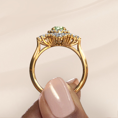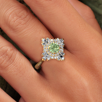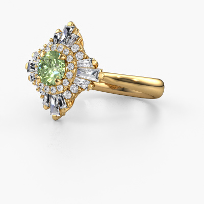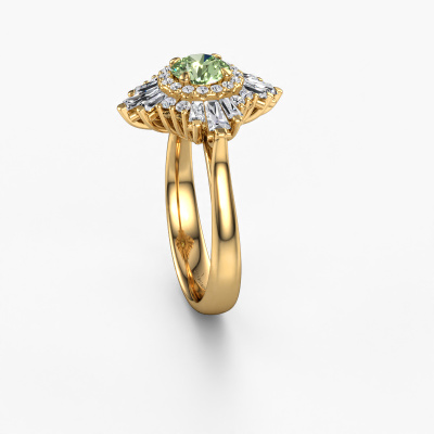 This 14 Carat gold ring is called Thalia and is set with 5.4 mm green lab grown diamond. An extraordinary gold vintage ring. One that will surely make the love of your life shine like a diamond! That is what we hope to achieve. This vintage engagement ring is set with exquisite green lab grown diamond. Whichever gemstone you choose from our selection, is up to you. The gemstone is selected with great care because we believe your special engagement ring must be adorned with nothing but the most beautiful gemstone. Wouldn't you agree? Our expert goldsmith will design your ring in our own crafting studio, where the green lab grown diamond will be set with great precision. The ring will then be polished till it shines perfectly. Nothing but the best for the love of your life! This jewel is made with passion and love by one of our master goldsmiths.After receiving your order, our goldsmiths will passionately start the creative process of making your engagement ring in our own studio. Because we don't have a big stockpile, these costs will not be passed on to you. Our pricing is proof of that! We offer top quality jewels at lowest price, guaranteed.Have you found a specific engagement ring somewhere which you would like to give to your loved one? Please feel free to express your wishes to our jewel designers because we would be honoured to turn your design into a vintage engagement ring. You can follow the development of your ring design because we use 3D drawings. This gives you a realistic preview of how your design will look. You can also preorder a dummy. A dummy is a plastic ring, which can be shaped according your ring design. You can try it on and check if its width and size are suitable for you. We will gladly send you a non-binding offer, based on a fair price/ quality ratio. It will amaze you, considering the quality of the ring and gemstones.To make it easier for you, we offer a 30 day return policy. Check our terms and conditions.
