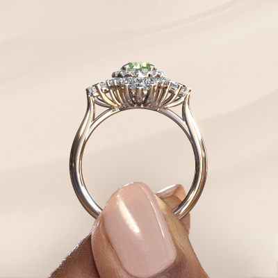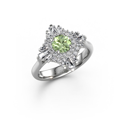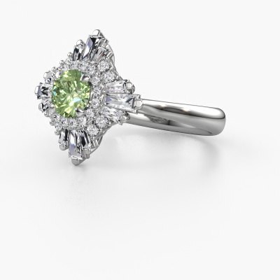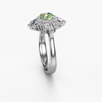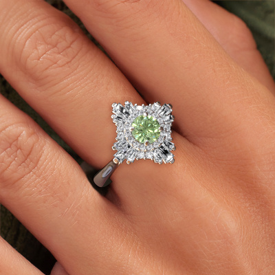 This platinum ring is called Thalia and is set with 5.4 mm green lab grown diamond. An extraordinary platinum vintage ring. One that will surely make the love of your life shine like a diamond! That is what we hope to achieve. This vintage engagement ring is set with exquisite green lab grown diamond. Whichever gemstone you choose from our selection, is up to you. The gemstone is selected with great care because we believe your special engagement ring must be adorned with nothing but the most beautiful gemstone. Wouldn't you agree? Our expert goldsmith will design your ring in our own crafting studio, where the green lab grown diamond will be set with great precision. The ring will then be polished till it shines perfectly. Nothing but the best for the love of your life! This jewel is made with passion and love by one of our master goldsmiths.After receiving your order, our goldsmiths will passionately start the creative process of making your engagement ring in our own studio. Because we don't have a big stockpile, these costs will not be passed on to you. Our pricing is proof of that! We offer top quality jewels at lowest price, guaranteed.Have you found a specific engagement ring somewhere which you would like to give to your loved one? Please feel free to express your wishes to our jewel designers because we would be honoured to turn your design into a vintage engagement ring. You can follow the development of your ring design because we use 3D drawings. This gives you a realistic preview of how your design will look. You can also preorder a dummy. A dummy is a plastic ring, which can be shaped according your ring design. You can try it on and check if its width and size are suitable for you. We will gladly send you a non-binding offer, based on a fair price/ quality ratio. It will amaze you, considering the quality of the ring and gemstones.To make it easier for you, we offer a 30 day return policy. Check our terms and conditions.