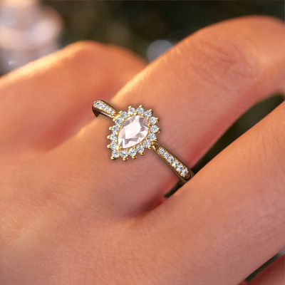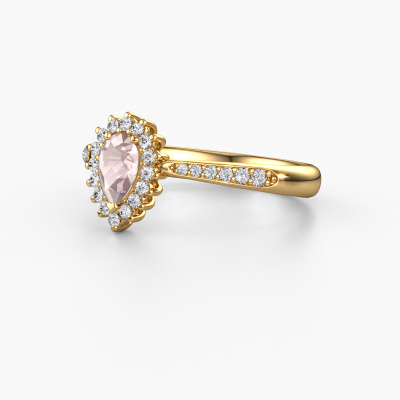 The ring shown above is called the Tilly per 2. We call this type of ring a cluster ring. The centre gemstone is surrounded by smaller sized stones. This 14 Carat gold version is set with a 6x4 mm pear morganite champagne centre stone, embraced by smaller diamonds. What makes this exclusive gold cluster ring special is the setting of the smaller gems surrounding the centre morganite champagne, which are shaped like a beautiful flower. The surrounding cluster of stones frame the middle centre stone in such a way to make it appear bigger. This type of engagement ring is also called a flower ring. It is very important that the smaller diamonds are positioned identically so there is no interference of light but perfect unity instead. Our skilled Goldsmiths get the job done. Each individual stone is carefully set by hand. During manufacturing, light fall is constantly monitored to make sure the special cluster effect is still visible. In the end you get the perfect engagement ring with a radiant morganite champagne gemstone centrepiece. You can imagine the effect of a ring of such significance when you give tot the love of your life on her special day to shine. This jewel is made just for you, with attention to detail and design.After receiving your order, our goldsmiths will passionately start the creative process of making your engagement ring in our own studio. Because we don't have a big stockpile, these costs will not be passed on to you. Our pricing is proof of that! We offer top quality jewels at lowest price, guaranteed.Different styles of new rings are made daily by our team. Perhaps you have found a cluster engagement ring somewhere. One you would like to give to your loved one. Please feel free to share your thoughts and design with our jewel designers. We would love to turn your design into a exclusive engagement ring. You can follow the development of your ring design because we use very detailed 3D drawings. On top of that, you can order a dummy of the design. A dummy is a plastic ring, which can be shaped according your ring design. You can try it on and check if the engagement ring is up to standard. We will gladly send you a non-binding offer, based on a fair price/ quality ratio. The offer will baffle you, considering the quality of the ring and gemstones.To make it easier for you, we offer a 30 day return policy. Check our terms and conditions.