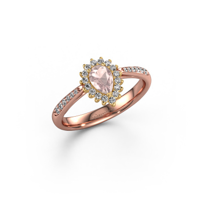 The ring shown above is called the Tilly per 2. We call this type of ring a cluster ring. The centre gemstone is surrounded by smaller sized stones. This 14 Carat rose gold version is set with a 6x4 mm pear morganite champagne centre stone, embraced by smaller diamonds. What makes this exclusive rose gold cluster ring special is the setting of the smaller gems surrounding the centre morganite champagne, which are shaped like a beautiful flower. The surrounding cluster of stones frame the middle centre stone in such a way to make it appear bigger. This type of engagement ring is also called a flower ring. It is very important that the smaller diamonds are positioned identically so there is no interference of light but perfect unity instead. Our skilled Goldsmiths get the job done. Each individual stone is carefully set by hand. During manufacturing, light fall is constantly monitored to make sure the special cluster effect is still visible. In the end you get the perfect engagement ring with a radiant morganite champagne gemstone centrepiece. You can imagine the effect of a ring of such significance when you give tot the love of your life on her special day to shine. This jewel is made just for you, with attention to detail and design.After receiving your order, our goldsmiths will passionately start the creative process of making your engagement ring in our own studio. Because we don't have a big stockpile, these costs will not be passed on to you. Our pricing is proof of that! We offer top quality jewels at lowest price, guaranteed.Different styles of new rings are made daily by our team. Perhaps you have found a cluster engagement ring somewhere. One you would like to give to your loved one. Please feel free to share your thoughts and design with our jewel designers. We would love to turn your design into a exclusive engagement ring. You can follow the development of your ring design because we use very detailed 3D drawings. On top of that, you can order a dummy of the design. A dummy is a plastic ring, which can be shaped according your ring design. You can try it on and check if the engagement ring is up to standard. We will gladly send you a non-binding offer, based on a fair price/ quality ratio. The offer will baffle you, considering the quality of the ring and gemstones.To make it easier for you, we offer a 30 day return policy. Check our terms and conditions.