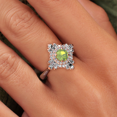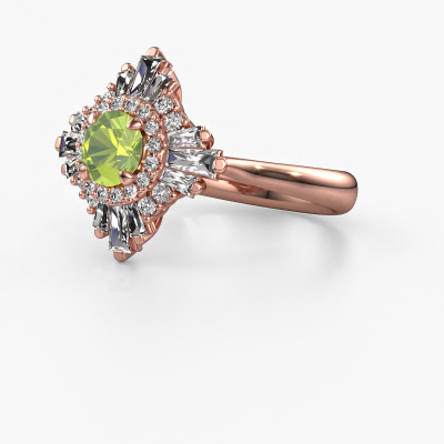 This 14 Carat rose gold ring is called Thalia and is set with 5.4 mm peridot. An extraordinary rose gold vintage ring. One that will surely make the love of your life shine like a diamond! That is what we hope to achieve. This vintage engagement ring is set with exquisite peridot. Whichever gemstone you choose from our selection, is up to you. The gemstone is selected with great care because we believe your special engagement ring must be adorned with nothing but the most beautiful gemstone. Wouldn't you agree? Our expert goldsmith will design your ring in our own crafting studio, where the peridot will be set with great precision. The ring will then be polished till it shines perfectly. Nothing but the best for the love of your life! This jewel is made with passion and love by one of our master goldsmiths.After receiving your order, our goldsmiths will passionately start the creative process of making your engagement ring in our own studio. Because we don't have a big stockpile, these costs will not be passed on to you. Our pricing is proof of that! We offer top quality jewels at lowest price, guaranteed.Have you found a specific engagement ring somewhere which you would like to give to your loved one? Please feel free to express your wishes to our jewel designers because we would be honoured to turn your design into a vintage engagement ring. You can follow the development of your ring design because we use 3D drawings. This gives you a realistic preview of how your design will look. You can also preorder a dummy. A dummy is a plastic ring, which can be shaped according your ring design. You can try it on and check if its width and size are suitable for you. We will gladly send you a non-binding offer, based on a fair price/ quality ratio. It will amaze you, considering the quality of the ring and gemstones.To make it easier for you, we offer a 30 day return policy. Check our terms and conditions.
