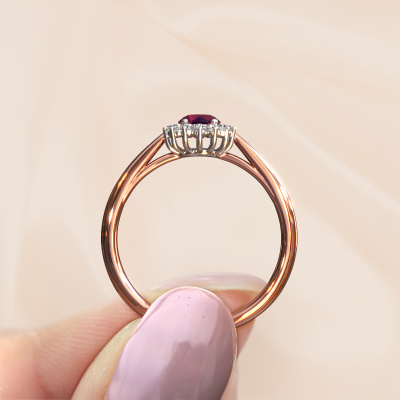 The ring shown above is called the Tilly RND 1. We call this type of ring a cluster ring. The centre gemstone is surrounded by smaller sized stones. This 14 Carat rose gold version is set with a 4.2 mm round rhodolite centre stone, embraced by smaller diamonds. What makes this classic rose gold cluster ring special is the setting of the smaller gems surrounding the centre rhodolite, which are shaped like a beautiful flower. The surrounding cluster of stones frame the middle centre stone in such a way to make it appear bigger. This type of engagement ring is also called a flower ring. It is very important that the smaller diamonds are positioned identically so there is no interference of light but perfect unity instead. Our skilled Goldsmiths get the job done. Each individual stone is carefully set by hand. During manufacturing, light fall is constantly monitored to make sure the special cluster effect is still visible. In the end you get the perfect engagement ring with a radiant rhodolite gemstone centrepiece. You can imagine the effect of a ring of such significance when you give tot the love of your life on her special day to shine. This jewel is made to shine bright around your finger. Each jewel is hand made with love by our goldsmiths.By using a combination of the latest modern techniques, combined with ancient crafting, we can make all our engagement rings in our own studio. Each jewel is made to order. This is advantageous because we can offer you a price you won't find anywhere else.Our team adds new designs to our online collection daily. Our designers and goldsmiths work together in creating the best design. We strive to offer a diverse collection of jewels. Perhaps you have a specific jewel design in mind. One you came across somewhere. Please contact us for a free consultation. We will make you an offer, based on a fair price/ quality ratio, that will baffle you.To make it easier for you, we offer a 30 day return policy. Check our terms and conditions.