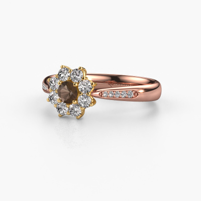The ring shown above is called the Carolyn 2. We call this type of ring a cluster ring. The centre gemstone is surrounded by smaller sized stones. This 14 Carat rose gold version is set with a 3.4 mm round smokey quartz centre stone, embraced by smaller diamonds. What makes this traditional rose gold cluster ring special is the setting of the smaller gems surrounding the centre smokey quartz, which are shaped like a beautiful flower. The surrounding cluster of stones frame the middle centre stone in such a way to make it appear bigger. This type of engagement ring is also called a flower ring. It is very important that the smaller diamonds are positioned identically so there is no interference of light but perfect unity instead. Our skilled Goldsmiths get the job done. Each individual stone is carefully set by hand. During manufacturing, light fall is constantly monitored to make sure the special cluster effect is still visible. In the end you get the perfect engagement ring with a radiant smokey quartz gemstone centrepiece. You can imagine the effect of a ring of such significance when you give tot the love of your life on her special day to shine. This jewel is unique in every way! Simply customize to your liking,Are you on a budget? Please feel free to contact us, so we can go discuss your options. We offer our engagement rings at guaranteed best price, because we make them to order. You won't find such a price anywhere else!Our team adds new designs to our online collection daily. Our designers and goldsmiths work together in creating the best design. We strive to offer a diverse collection of jewels. Perhaps you have a specific jewel design in mind. One you came across somewhere. Please contact us for a free consultation. We will make you an offer, based on a fair price/ quality ratio, that will baffle you.To make it easier for you, we offer a 30 day return policy. Check our terms and conditions.