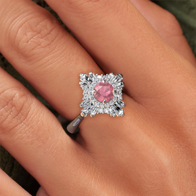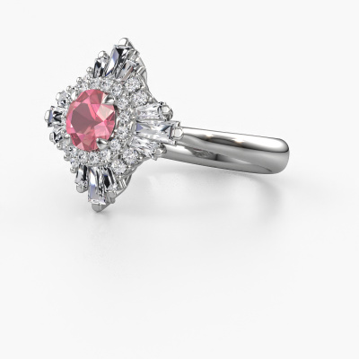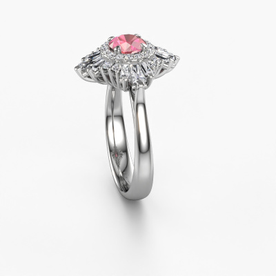 This platinum ring is called Thalia and is set with 5.4 mm tourmaline pink. An extraordinary platinum vintage ring. One that will surely make the love of your life shine like a diamond! That is what we hope to achieve. This vintage engagement ring is set with exquisite tourmaline pink. Whichever gemstone you choose from our selection, is up to you. The gemstone is selected with great care because we believe your special engagement ring must be adorned with nothing but the most beautiful gemstone. Wouldn't you agree? Our expert goldsmith will design your ring in our own crafting studio, where the tourmaline pink will be set with great precision. The ring will then be polished till it shines perfectly. Nothing but the best for the love of your life! This jewel is made with passion and love by one of our master goldsmiths.After receiving your order, our goldsmiths will passionately start the creative process of making your engagement ring in our own studio. Because we don't have a big stockpile, these costs will not be passed on to you. Our pricing is proof of that! We offer top quality jewels at lowest price, guaranteed.Have you found a specific engagement ring somewhere which you would like to give to your loved one? Please feel free to express your wishes to our jewel designers because we would be honoured to turn your design into a vintage engagement ring. You can follow the development of your ring design because we use 3D drawings. This gives you a realistic preview of how your design will look. You can also preorder a dummy. A dummy is a plastic ring, which can be shaped according your ring design. You can try it on and check if its width and size are suitable for you. We will gladly send you a non-binding offer, based on a fair price/ quality ratio. It will amaze you, considering the quality of the ring and gemstones.To make it easier for you, we offer a 30 day return policy. Check our terms and conditions.